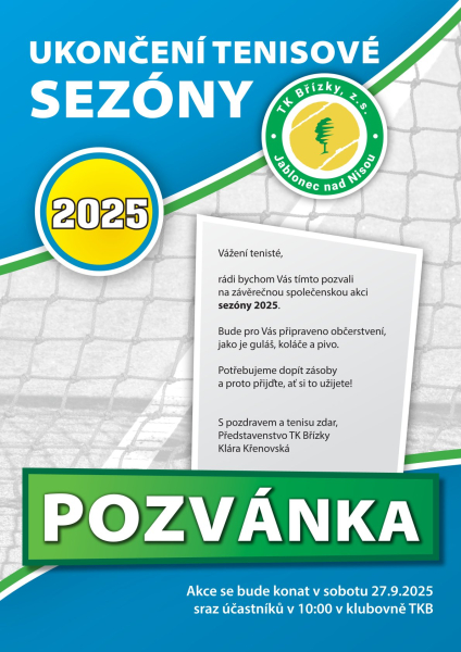 Uteklo to jako voda a už se opět loučíme s antukovou sezónou. V sobotu 27.9.2025 v klubovně od 10 hodin. Bohoušek nám opět připraví gulášek a vychladí pivo. Přijďte si zahrát a popovídat.